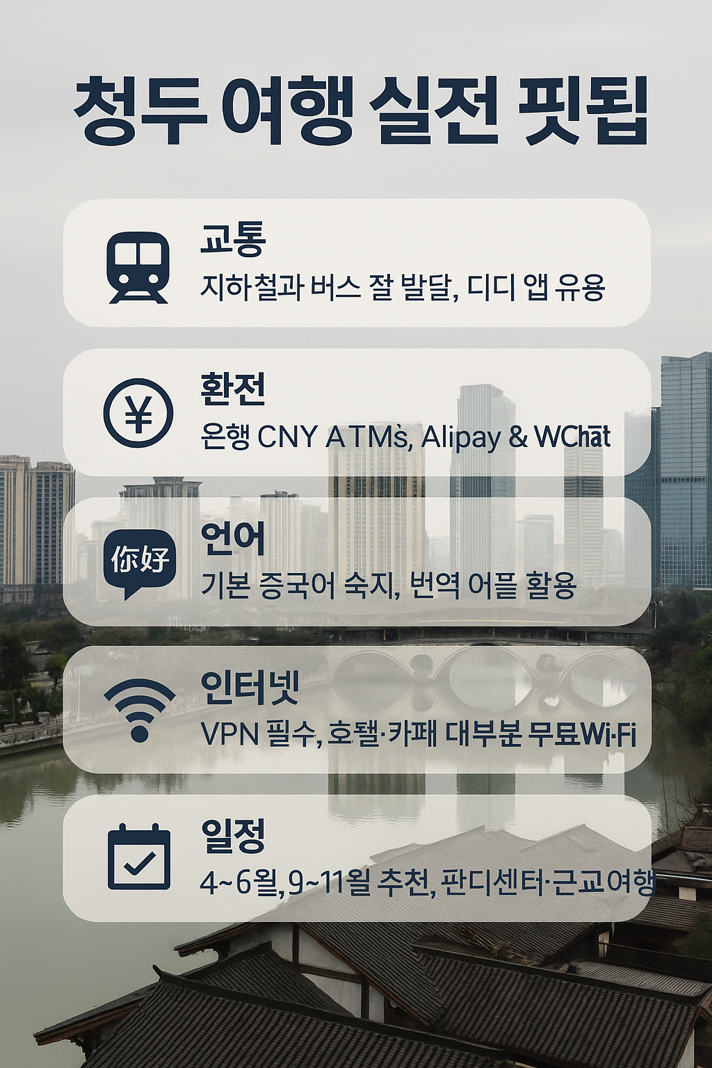 청두는 낯선 만큼이나 매력적인 도시입니다. 미리 준비하면 더욱 풍부하고 안전한 여행이 되니 위 정보를 참고해 여유 있는 여행을 즐겨보세요!